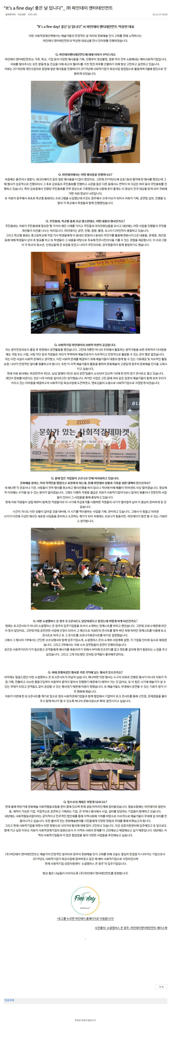 (주)파인데이 엔터테인먼트는 예술가의 안정적인 일자리와 광주의 문화예술 인식 고취를 위해 오늘도 열심히 한걸음 더 나아가는 기업으로서 2019년도 사회적기업가 육성사업에 참여하였고 같은 해 예비 사회적기업으로 지정되었으며, 현재 사회적기업 성장지원센터 '소셜캠퍼스 온 광주'의 입주기업입니다.