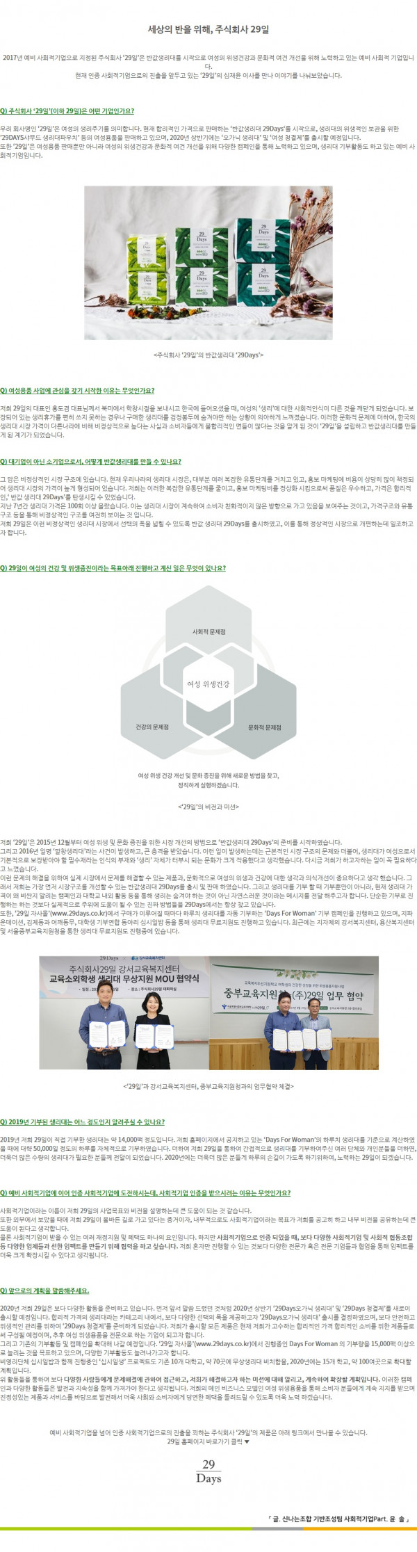 2017년 예비 사회적기업으로 지정된 주식회사 ‘29일’은 반값생리대를 시작으로 여성의 위생건강과 문화적 여건 개선을 위해 노력하고 있는 예비 사회적 기업입니다.