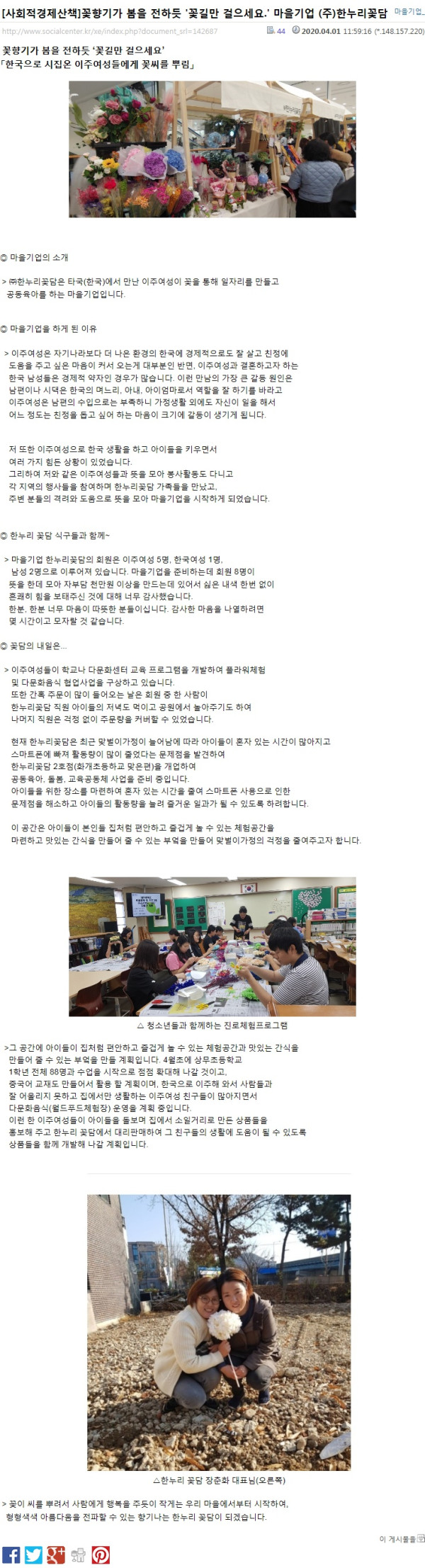 > ㈜한누리꽃담은 타국(한국)에서 만난 이주여성이 꽃을 통해 일자리를 만들고