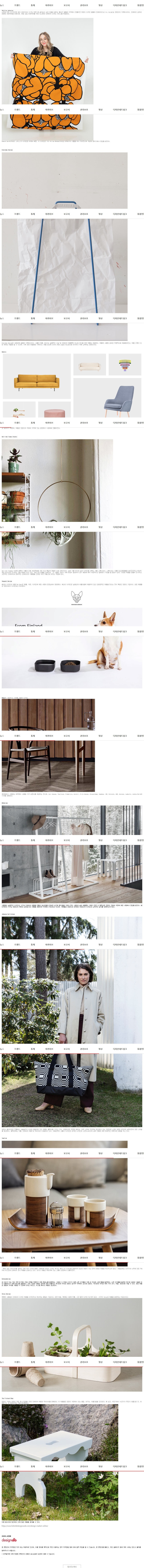 Helsinki Design Week는 4월 24일부터 26일까지 온라인에서 처음으로 디자인 마켓을 개최했다. 디자인 마켓의 고전적인 아이템들 중에서 일상적인 디자인 제품인 종이 가방 홀더, 직물들 뿐 아니라 가구들과 같은 홈 인테리어 제품이 소개되었다. 모든 판매자는 주말 내내 온라인 판매 아이템을 매일 새롭게 추가했다. 그 중 자가 격리로 집에서 보내는 시간이 많아진 사람들을 위한 인테리어 제품이 주를 이루었다. 디자인 마켓 온라인에 참여한 핀란드 인테리어 브랜드를 아래에 소개한다.