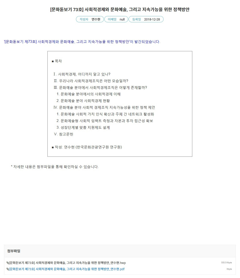 사회적경제와 문화예술, 그리고 지속가능을 위한 정책방안 (한국문화관광연구원) 지역혁신경제연대 0 6040 2019.06.21 07:17 https://policydb.kcti.re.kr/#/domesticMonthlyDetail?bbstypecd=3001013&… + 2245 2019.06.21 07:17 [문화돋보기 제73호] 사회적경제와 문화예술, 그리고 지속가능을 위한 정책방안_연수현.pdf (587.9K) + 333 사회적경제와 문화예술, 그리고 지속가능을 위한 정책방안