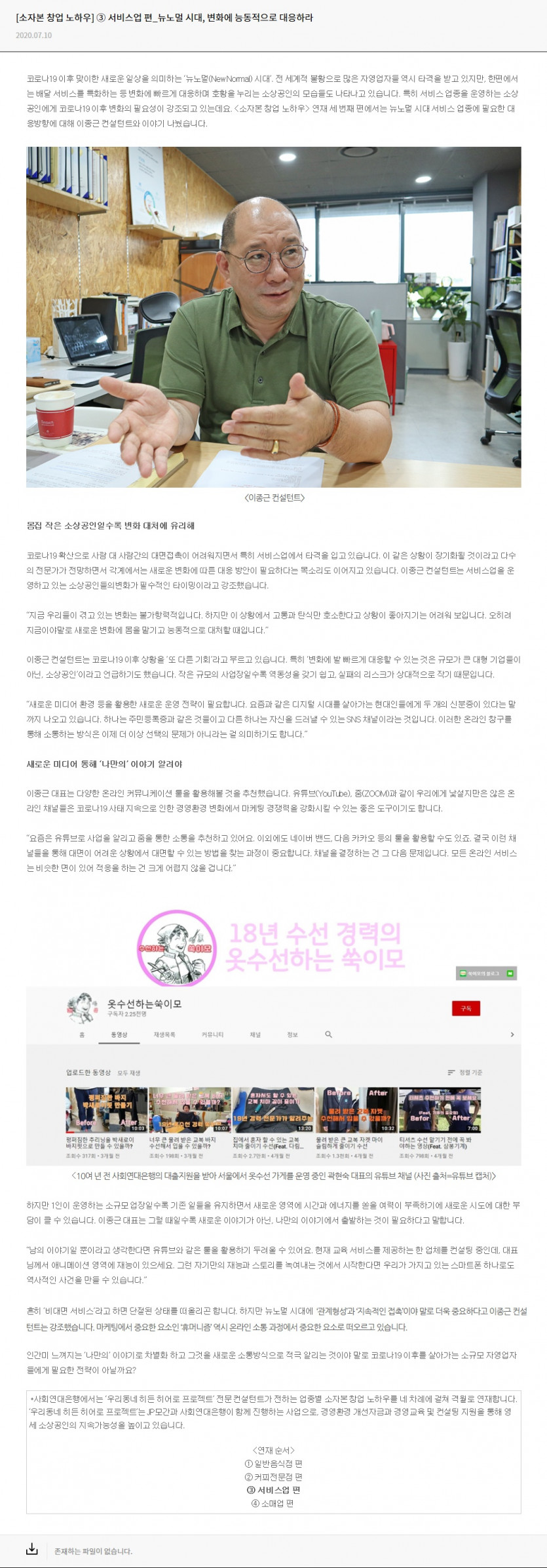 “요즘은 유튜브로 사업을 알리고 줌을 통한 소통을 추천하고 있어요. 이외에도 네이버 밴드, 다음 카카오 등의 툴을 활용할 수도 있죠. 결국 이런 채널들을 통해 대면이 어려운 상황에서 대면할 수 있는 방법을 찾는 과정이 중요합니다. 채널을 결정하는 건 그 다음 문제입니다. 모든 온라인 서비스는 비슷한 면이 있어 적응을 하는 건 크게 어렵지 않을 겁니다.”