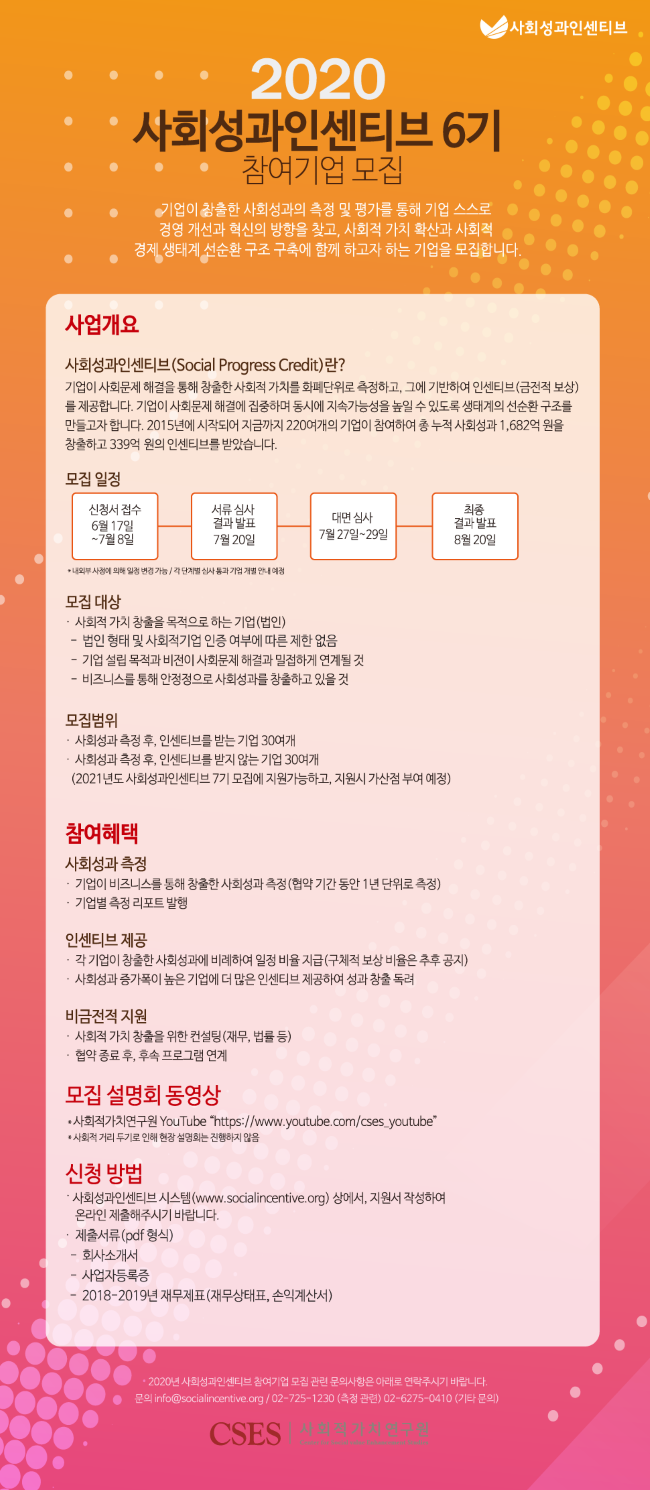 [모집공고] 2020 사회성과인센티브 참여기업 모집 공고(접수마감 7.8까지) | 사회적가치연구원 지역혁신경제연대 0 8472 2020.06.21 07:21 http://www.socialenterprise.or.kr/notice/open.do?page=1&cmd=&search_wo… + 3047 2020 사회성과인센티브 6기 참여기업 모집사회적가치연구원은 기업이 창출한 사회성과의 측정 및 평가를 통해 스스로 기업 경영 개선과 현식의 방향을 찾고, 사회적 가치 확산과 사회적 경제 생태계 선순환 구조 구축에 함께 하고자 하는 기업을 모집합니다.- 모집 대상: 사회적 가치 창출을 목적으로 하는 기업- 모집 일정 신청서 접수: 20년 6월 17일 ~ 7월 8일 서류 심사 발표: 20년 7월 20일 대면 심사: 20년 7월 27일 ~ 7월 29일 최종 발표: 20년 8월 20일