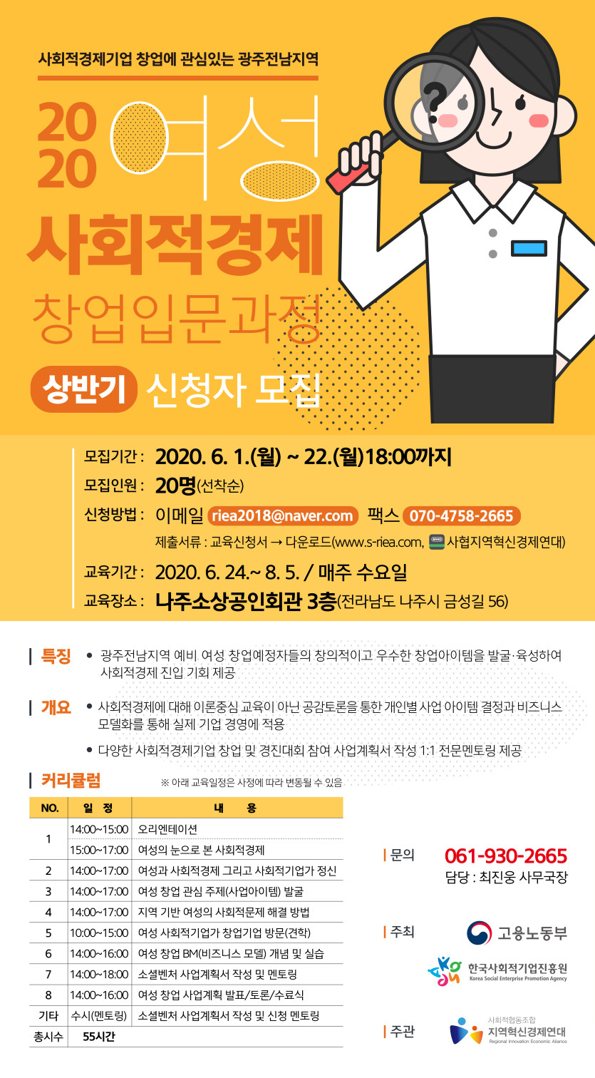 2020년 사회적경제 분야별(여성) 창업입문과정 광주·전남지역 상반기 교육생 모집공고 지역혁신경제연대 0 8309 2020.06.03 15:16 2020.06.03 15:16 01.공고문_2020년도 창업입문과정.hwp (282.0K) + 417 2020.06.03 15:16 02.신청서_2020년도 창업입문과정.hwp (21.0K) + 426 2020년 사회적경제 분야별(여성) 창업입문과정 광주·전남지역 상반기 교육생 모집공고