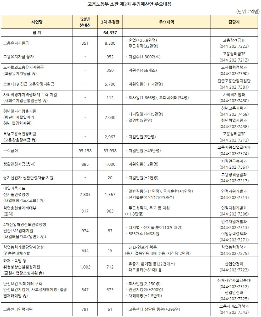 6월 3일, 국무회의에서 의결된 2020년도 고용노동부 소관 제3차 추가경정예산안은 총 6조 4,337억원으로 주요내용은 다음과 같다.