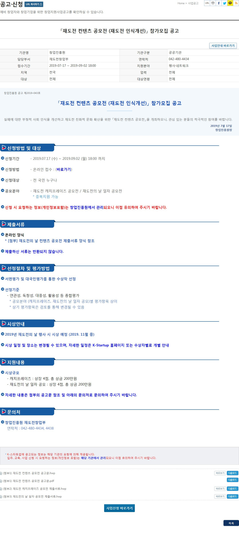 [공모전] 「재도전 컨텐츠 공모전 (재도전 인식개선)」 참가모집 공고 (접수마감 9.2까지) (창업진흥원) 지역혁신경제연대 0 6890 2019.07.20 06:25 http://www.k-startup.go.kr/common/announcement/announcementDetail.do?m… + 2855 2019.07.20 06:25 첨부1 재도전 컨텐츠 공모전 공고문.hwp (73.0K) + 402 2019.07.20 06:25 첨부1 재도전 컨텐츠 공모전 공고문.pdf (283.9K) + 392 2019.07.20 06:25 첨부2 재도전 캐치프레이즈 공모전 제출서류.hwp (49.0K) + 389 2019.07.20 06:25 첨부3 재도전의 날 일자 공모전 제출서류.hwp (47.5K) + 400 신청기간 : 2019.07.17 (수) ~ 2019.09.02 (월) 18:00 까지 신청방법 : 온라인 접수 : (바로가기)신청대상 : 전 국민 누구나공모분야 : 재도전 캐치프레이즈 공모전 / 재도전의 날 일자 공모전 * 중복지원 가능