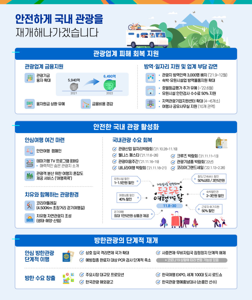 단계적 일상 회복에 발맞춰 국민들은 안전하게 여행을 누리고, 관광업계는 활력을 되찾을 수 있는 방안을 담은 것이다.