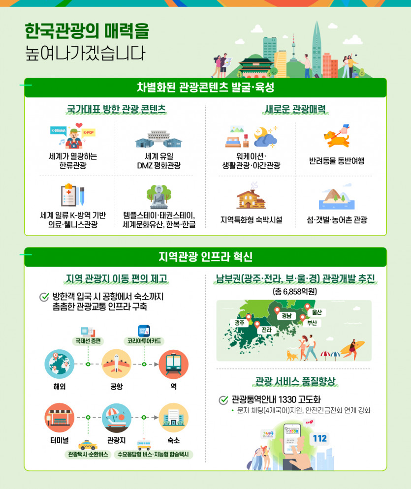 광주ㆍ전라ㆍ부산ㆍ울산ㆍ경상남도를 연계한 남부권 관광개발을 새롭게 추진하는 등 안전한 국내 여행 환경을 만드는 한편, 다양한 관광 관련 박람회, 쇼핑관광축제 등을 개최하고, 선제적으로 대규모 방한 관광 마케팅도 실시할 계획이다.
