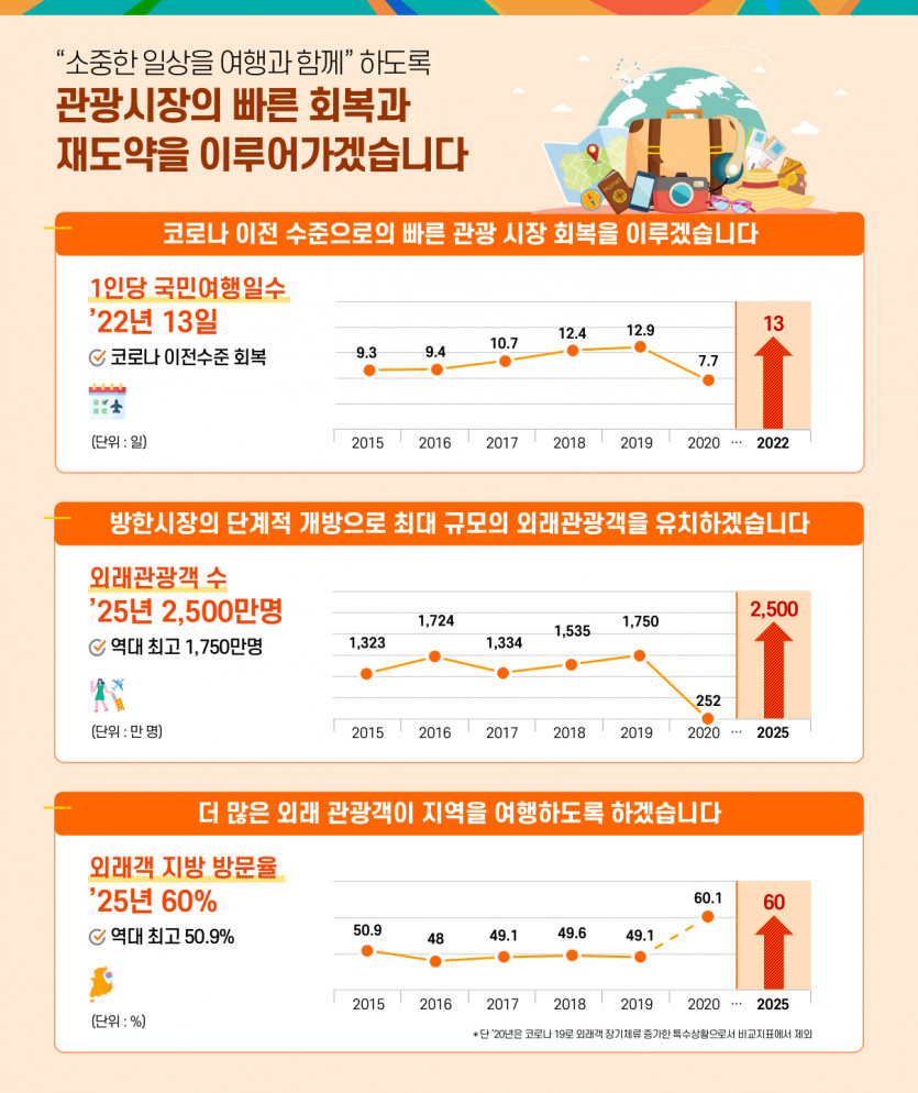 이 같은 대책으로 조속한 관광시장 정상화를 추진해 내년 말경에는 코로나19 이전의 국내 여행 수준 회복을 목표로 삼았다.