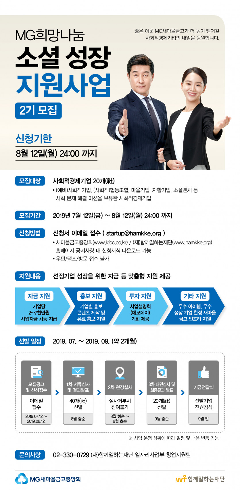 [기업모집] MG희망나눔 소셜 성장 지원사업 2기 모집 (접수마감 8.12까지) (새마을금고중앙회, 함께일하는재단)