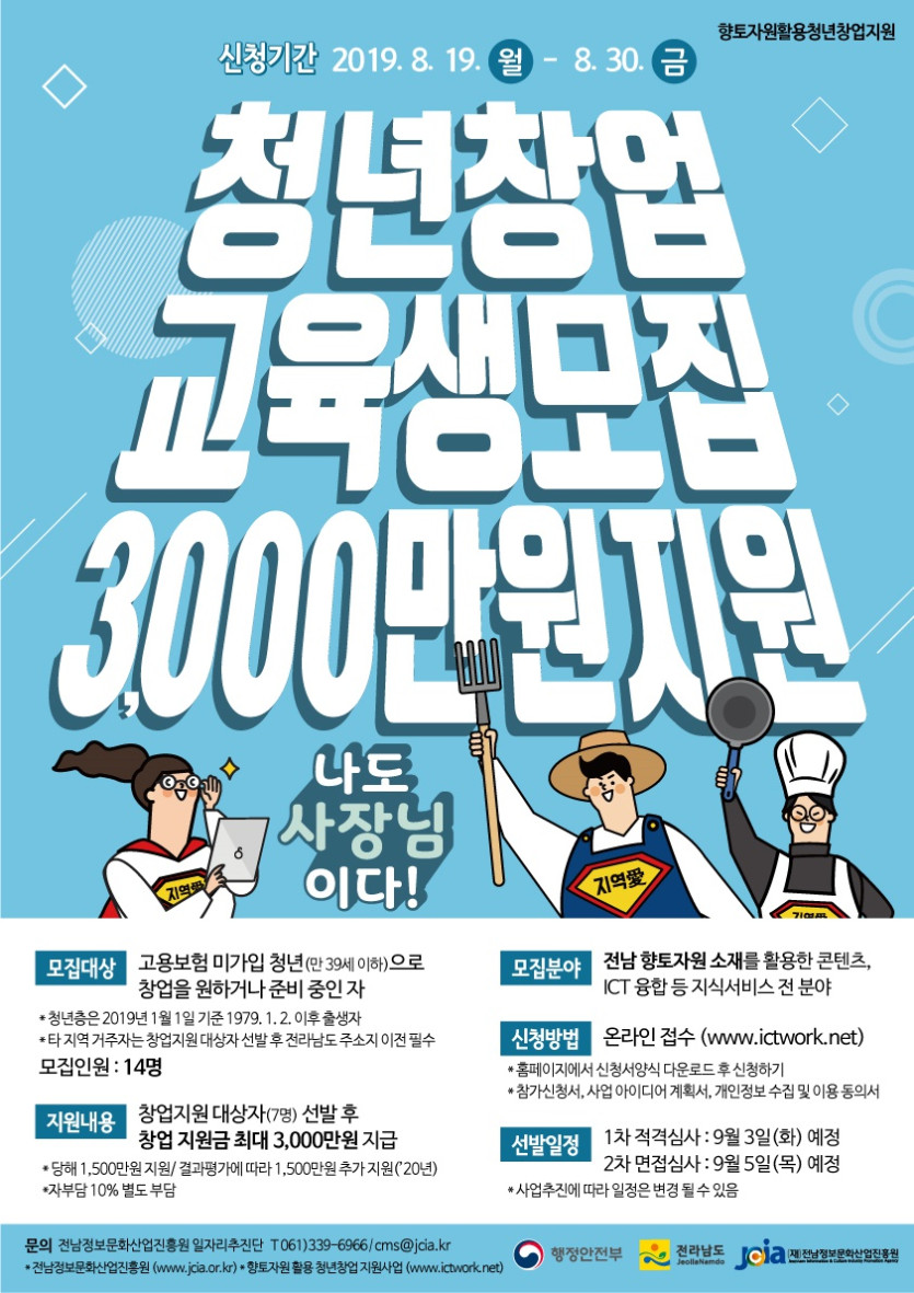 [교육생 모집] '향토자원 활용 청년창업 지원사업' 예비 청년 창업자(교육생) 2차 모집 (접수마감 8.30까지) (전남정보문…