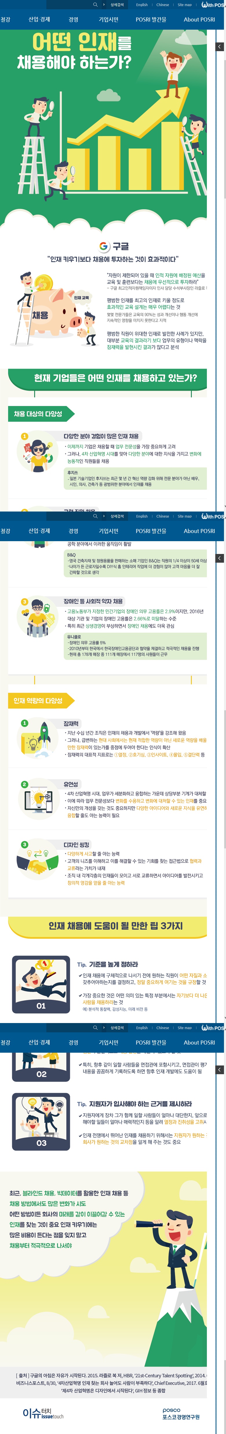 어떤 인재를 채용해야 하는가? (포스코경영연구원) 지역혁신경제연대 0 8704 2019.08.15 06:51 https://www.posri.re.kr/ko/board/content/15010 + 3945 최근 블라인드 채용, 빅데이터를 활용한 인재 채용 등 채용 방법에서도 많은 변화가 시도되고 있다. 어떤 방법이든 회사의 미래를 같이 이끌어갈 수 있는 인재를 찾는 것이 중요하다.