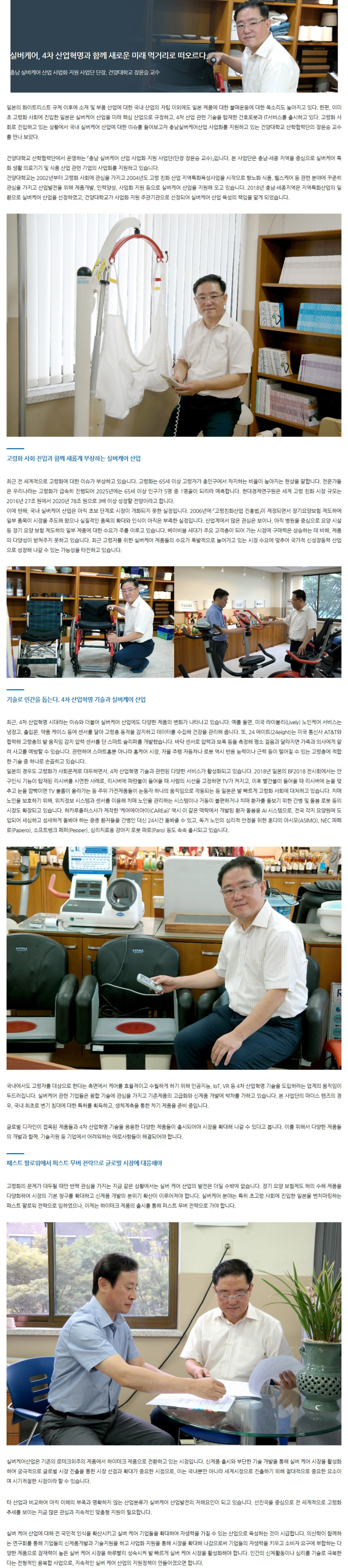 건양대학교 산학협력단에서 운영하는 「충남 실버케어 산업 사업화 지원 사업단(단장 장윤승 교수)」입니다. 본 사업단은 충남·세종 지역을 중심으로 실버케어 특화 생활 의료기기 및 식품 산업 관련 기업의 사업화를 지원하고 있습니다.