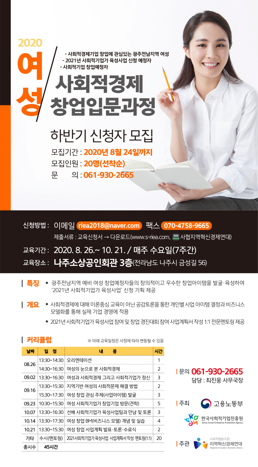 [모집공고] 2020년 사회적경제 분야별(여성) 창업입문과정 - 광주·전남지역 하반기 교육생 모집공고 (접수마감 8.24까지)…