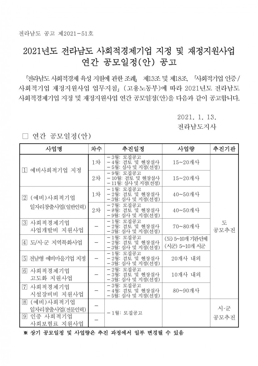 [공고] 2021년도 전라남도 사회적경제기업 지정 및 재정지원사업 연간 공모일정(안) 공고 (전라남도) 지역혁신경제연대 0 3925 2021.01.15 06:34 http://jn-se.kr/bbs/board.php?bo_table=nco4_1&wr_id=308 + 1252 2021.01.15 06:34 사회적경제기업지정및재정지원사업연간공모일정.hwp (17.0K) + 117 「전라남도 사회적경제 육성 지원에 관한 조례」 제13조 및 제18조, 「사회적기업 인증 / 사회적기업 재정지원사업 업무지침」(고용노동부)에 따라 2021년도 전라남도 사회적경제기업 지정 및 재정지원사업 연간 공모일정(안)을 다음과 같이 공고합니다.2021. 1. 13.전라남도지사