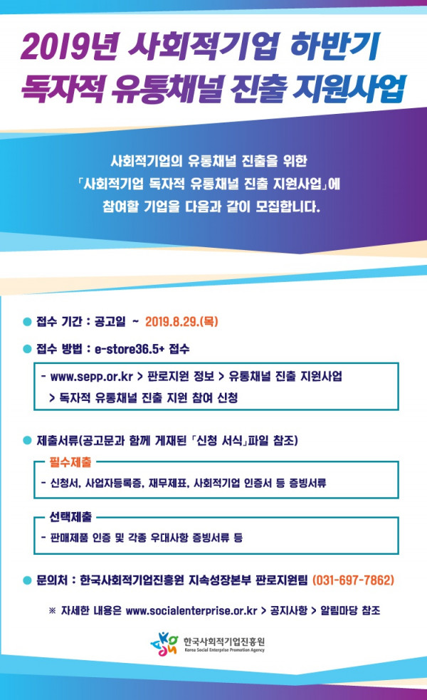 [기업모집] 사회적기업 하반기 독자적 유통채널 진출 지원사업 참여기업 모집공고 (접수마감 8.29까지) (한국사회적기업진흥원)