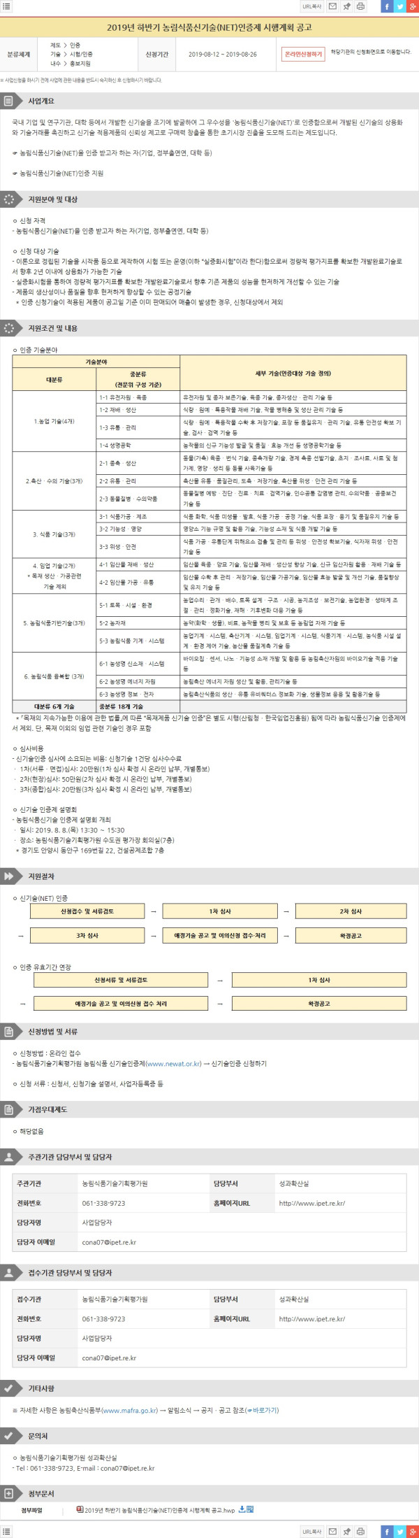 [사업공고] 2019년 하반기 농림식품신기술(NET)인증제 시행계획 공고 (접수마감 8.26까지) (농림식품기술기획평가원)