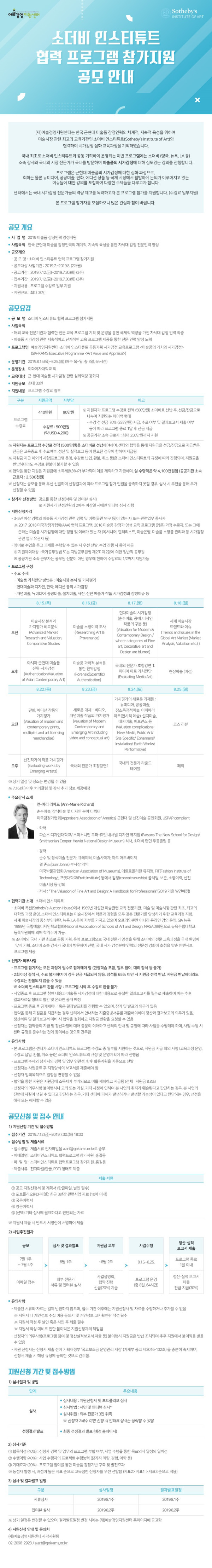 [공모] 소더비 인스티튜트 협력 프로그램 참가 지원 공모 (접수마감 7.30까지) (예술경영지원센터) 지역혁신경제연대 0 7505 2019.07.19 06:53 http://www.gokams.or.kr/01_news/notice_view.aspx?Idx=2544 + 2583 2019.07.19 06:53 공모안내_소더비인스티튜트 협력 프로그램 참가지원.pdf (360.9K) + 329 2019.07.19 06:53 공모지원신청서_소더비인스티튜트 협력프로그램 참가지원_지원자이름0.hwp (54.0K) + 307 소더비 인스티튜트 협력 프로그램 참가 지원 공모