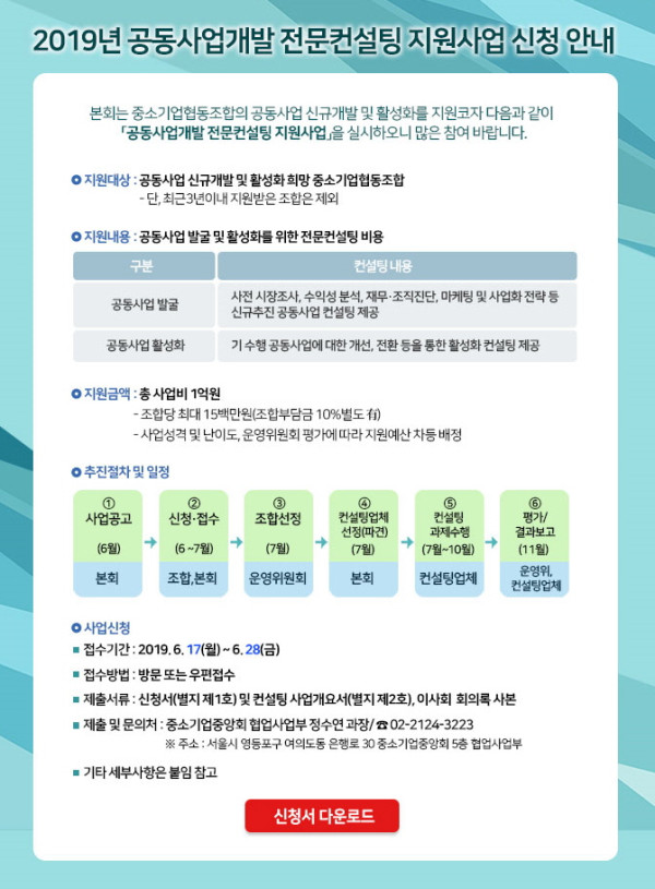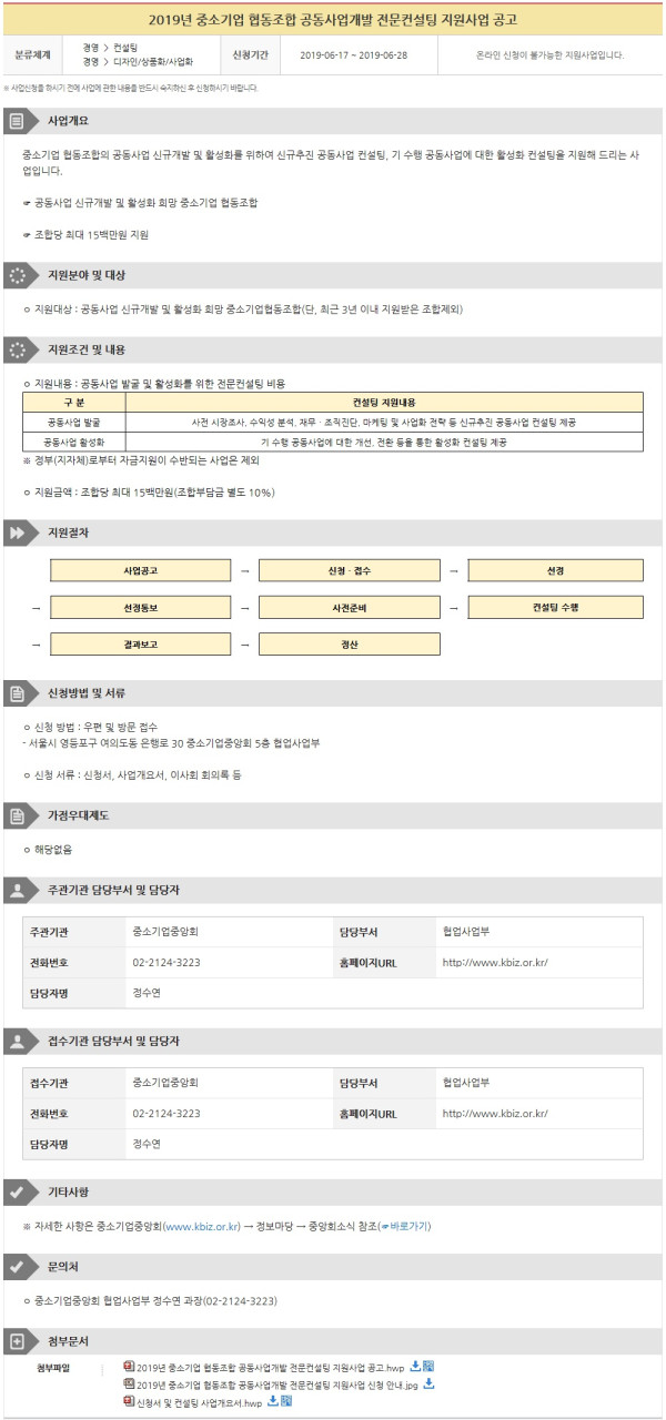 2019년 중소기업 협동조합 공동사업개발 전문컨설팅 지원사업 공고 (접수마감 6.28까지) (중소기업중앙회) 지역혁신경제연대 0 6568 2019.06.19 07:06 http://www.bizinfo.go.kr/see/seea/selectSEEA140Detail.do?target=M&pbla… + 2481 2019.06.19 07:06 2019년 중소기업 협동조합 공동사업개발 전문컨설팅 지원사업 공고.hwp (69.0K) + 264 2019.06.19 07:06 신청서 및 컨설팅 사업개요서.hwp (16.0K) + 261 2019년 중소기업 협동조합 공동사업개발 전문컨설팅 지원사업 공고
