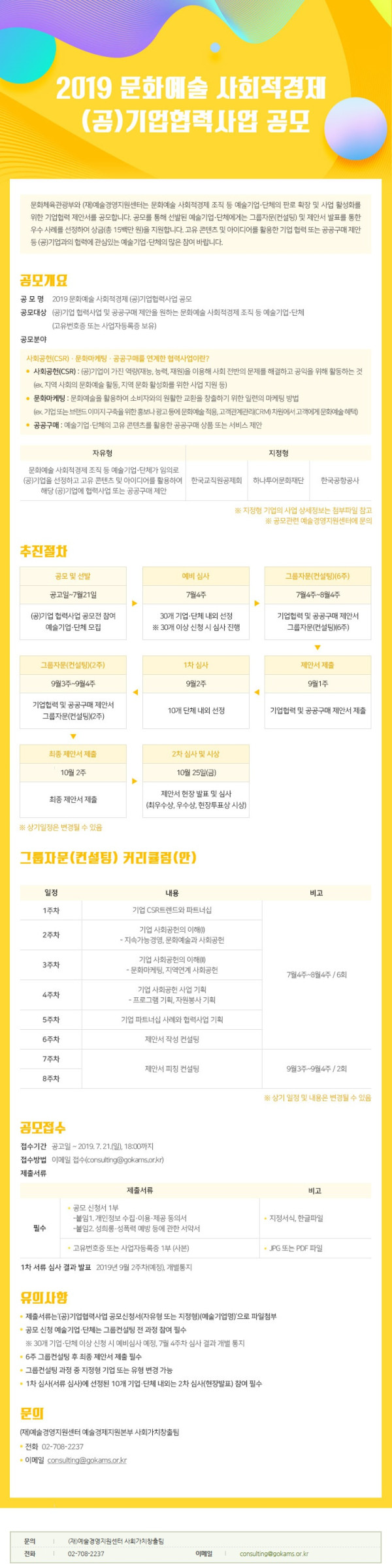 2019 문화예술 사회적경제 (공)기업협력사업 공모 (접수마감 7.21까지) (예술경영지원센터) 지역혁신경제연대 0 6495 2019.06.28 07:18 http://www.gokams.or.kr/01_news/notice_view.aspx?Idx=2537 + 2285 2019.06.28 07:19 공기업협력사업 공모요강3.hwp (32.5K) + 274 2019.06.28 07:19 공기업협력사업 공모신청서3.hwp (40.0K) + 274 2019 문화예술 사회적경제 (공)기업협력사업 공모 ㅇ 공 모 명 : 2019 문화예술 사회적경제 (공)기업협력사업 공모 ㅇ 공모대상 : (공)기업 협력사업 및 공공구매 제안을 원하는 문화 예술 사회적경제 조직 등 예술기업·단체(고유번호증 또는 사업자등록증 보유)