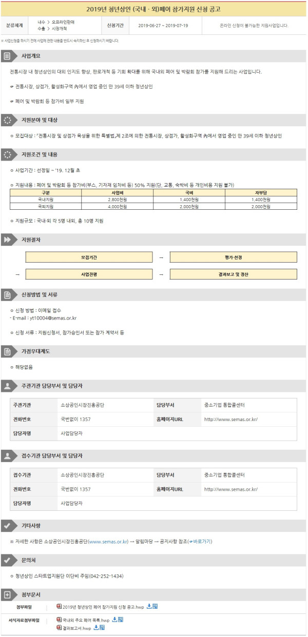 2019년 청년상인 (국내ㆍ외)페어 참가지원 신청 공고 (접수마감 7.19까지) (소상공인시장진흥공단) 지역혁신경제연대 0 6544 2019.06.29 07:17 http://www.bizinfo.go.kr/see/seea/selectSEEA140Detail.do?target=M&pbla… + 2480 2019.06.29 07:17 2019년 청년상인 페어 참가지원 신청 공고.hwp (28.5K) + 271 2019.06.29 07:17 국내외 주요 페어 목록.hwp (27.0K) + 281 2019.06.29 07:17 결과보고서.hwp (14.0K) + 275 2019년 청년상인 (국내ㆍ외)페어 참가지원 신청 공고