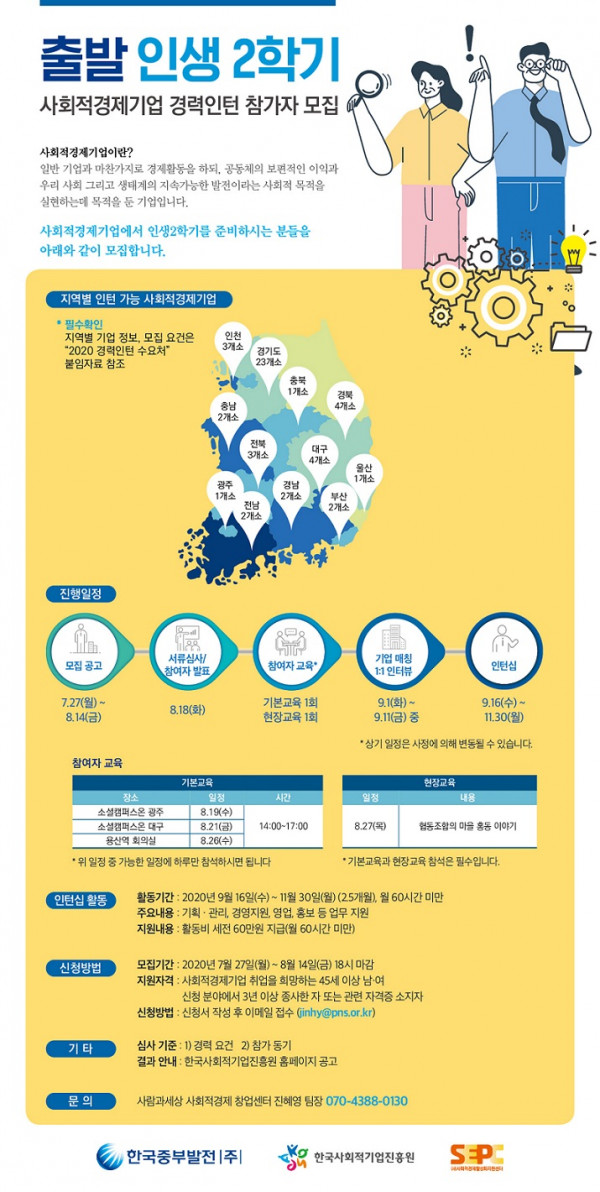 [모집공고] 사회적경제 경력인턴(신중년) 참가자 모집 (접수마감 8.14까지) | 사람과세상 지역혁신경제연대 0 7911 2020.08.01 09:16 http://www.socialenterprise.or.kr/notice/announce.do?page=&cmd=&search… + 2670 2020.08.01 09:16 1. 2020 경력인턴 수요처48개소.pdf (524.3K) + 344 2020.08.01 09:16 2. 참가신청서_참가자명.hwp (35.5K) + 305 사회적경제 경력인턴(신중년) 참가자 모집