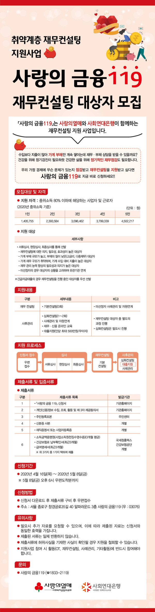 [지원사업] 취약계층 재무컨설팅 및 긴급대출지원사업 - 사랑의 금융 119 (접수마감 5.8까지) | 사회연대은행 지역혁신경제연대 0 7905 2020.05.01 08:54 http://www.bss.or.kr/load.asp?subPage=133.view&idx=2362 + 2776 2020.05.01 08:54 신청서_및_개인정보_수집_동의서.hwp (22.0K) + 333 취약계층 재무컨설팅 및 긴급대출지원사업 - 사랑의 금융 119