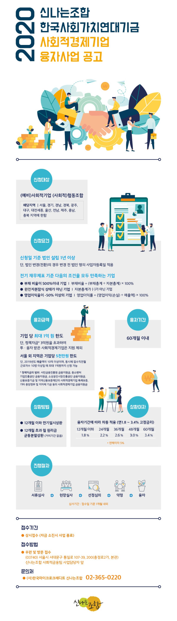 [자금지원] 2020년 한국사회가치연대기금 사회적경제기업 융자사업 공고 (접수마감 : 자금소진시까지) | 신나는조합