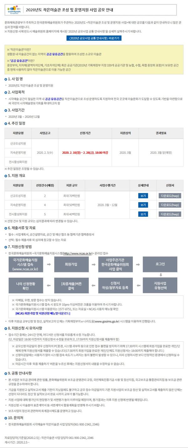 2020년 작은미술관 조성 및 운영지원 사업 공모 안내 (접수마감 2.28까지) (한국문화예술위원회)