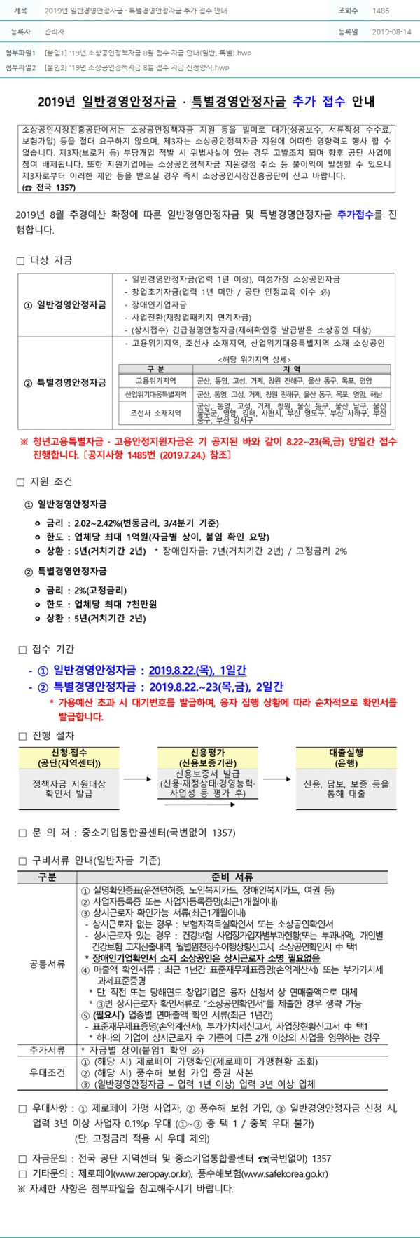 [자금지원] 2019년 일반경영안정자금 · 특별경영안정자금 추가 접수 안내 (접수마감 8.22~23까지) (소상공인시장진흥공단…