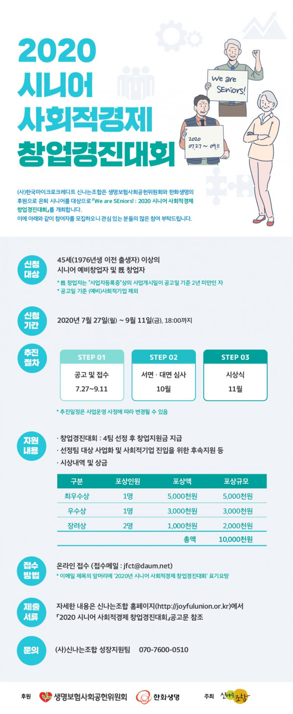 [모집공고] 2020년 시니어 사회적경제 창업경진대회 모집 공고 (접수마감 9.11) | 신나는조합 지역혁신경제연대 0 7882 2020.08.07 06:39 http://joyfulunion.or.kr/new/xe/archives/23636 + 2711 2020.08.07 06:39 2020-시니어-사회적경제-창업경진대회-공고문.hwp (83.5K) + 340 2020.08.07 06:39 서식5-2020-시니어-사회적경제-창업경진대회-참가신청-정보입력-양식_기업명.xlsx (14.8K) + 325 2020.08.07 06:39 서식-142020-시니어-사회적경제-창업경진대회-신청서.hwp (53.0K) + 335 2020년 시니어 사회적경제 창업경진대회 모집 공고