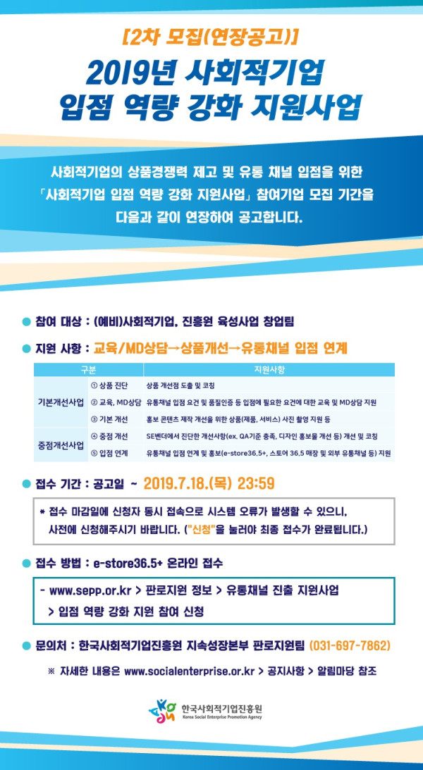 사회적기업 입점 역량 강화 지원사업 참여기업 2차 모집 연장 공고 (접수마감 7.18까지) (한국사회적기업진흥원)