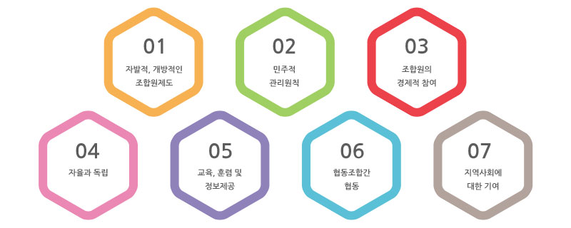 "협동조합은 자조·민주·공정·연대 등의 가치를 기본으로 하며, 조합원은 협동조합 선구자들의 전통에 따라 정직·공개·사회적 책임·타인에 대한 배려 등의 가치를 신조로 한다."
